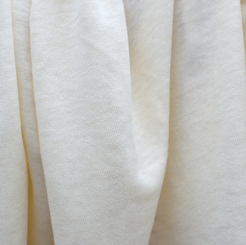 A long-lasting, off-white linen jersey (single jersey) of extraordinary quality. The fabric was made exclusively in Germany. Organic flax from northern France, Belgium and the Netherlands was spun into the finest yarn and then plied. This means that in each case two individual threads were twisted so as to increase strength and even out yarn irregularities. The yarn used for this jersey is thus very strong and it keeps an extraordinarily smooth surface. It must be noticed that only flax of very high quality can be processed in this way. This bleached jersey is especially suitable for clothing: dresses, skirts, slacks, T-shirts, tops, tunics, sports clothing or children’s clothing. It was knitted as tube and then cut apart for washing and stretching, so it offers a great width of 162 cm. It should be noted that pure linen is still running quite a bit in the first wash, usually 3 to 5%. To determine the exact shrinkage, we suggest washing samples first. Please note: Natural linen will fade in the sun. The jersey is best to be dried in shade and gently stretched into shape for drying, preferably lying flat as is best done with most knitted fabrics. Wash at 40°C and use mild detergent without brighteners. “Linen likes to swim”. Therefore when machine washing only fill up half and at most up to two-thirds. Hand wash or hand wash program only. Gently squeeze for excessive water but do never wring the linen jersey strongly. Iron linen at high temperature, on reverse while still damp. Please notice, that the color of the picture may not necessarily accurately reflect the color of the fabric. swatches . care.